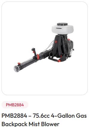 Professional 75.6cc gas backpack mist blower with 4-gallon tank capacity for large-scale spraying applications. Powerful engine provides consistent misting performance for pest control, fertilizer application, and disinfection. Ergonomic backpack design distributes weight evenly for comfortable extended use.